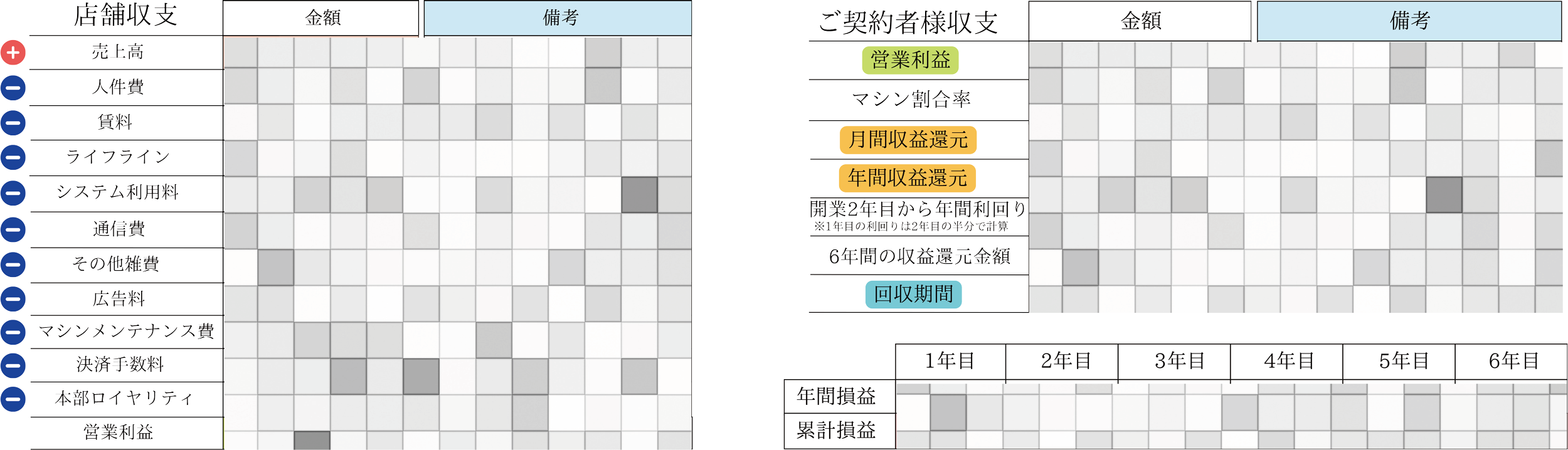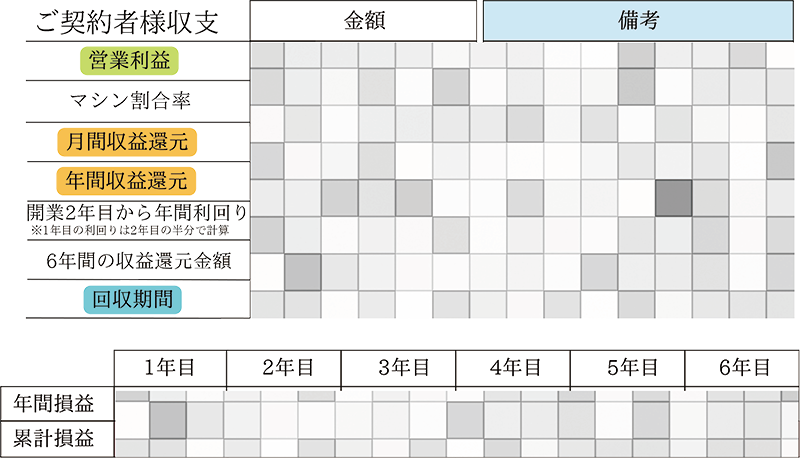 店舗の⽉間売上から賃料、⼈件費、ライフライン等の必要経費を差し引いた営業利益に基づき、ご契約いただいたマシンに応じたパーセンテージで収益還元を算出し、それを取得するシステムです。